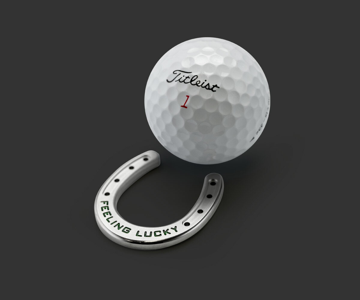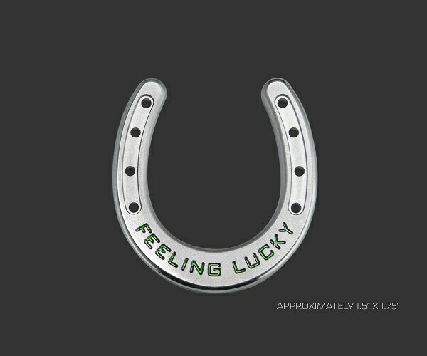 スコッティキャメロン ラッキーホースシュー ステンレスボールマーカー ステンレスブロックからの削り出し製造、ホースシューに8個のホール、グリーンでスコッティキャメロン、裏側にフィーリングラッキー大きめで重量感のあるボールマーカー1.5x1.75インチ、約17.5グラム[CRLF][CRLF]